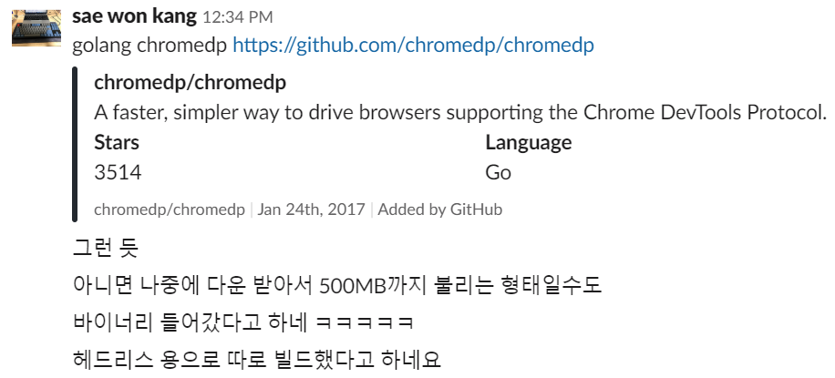 Chromedp 는 Puppeteer 와 다르게 구성도 특이하고 쓰기도 조금 복잡한 편입니다. Puppeteer 에서는 대부분의 기능을 쉽게 사용할 수 있고 문서화도 잘 되어 있는 편인데, Chromedp 는 먼저 Chrome Dev Protocol 스팩에서 자동으로 코드를 생성한 라이브러리인 cdproto 가 있고, 이를 Chromedp 가 추상화 해 놓은 형태인데 모든 부분을 추상화 한 것 아니여서, 제대로 사용 하려면 Chromedp 문서와 cdproto 문서를 같이 봐 가면서 사용해야 했습니다. 예전에 C 언어로 GObject 를 써보면서 받은 절차지향에 객체지향은 어거지로 넣은것을 쓰는것과 약간 비슷한 느낌 이였던 것 같네요.