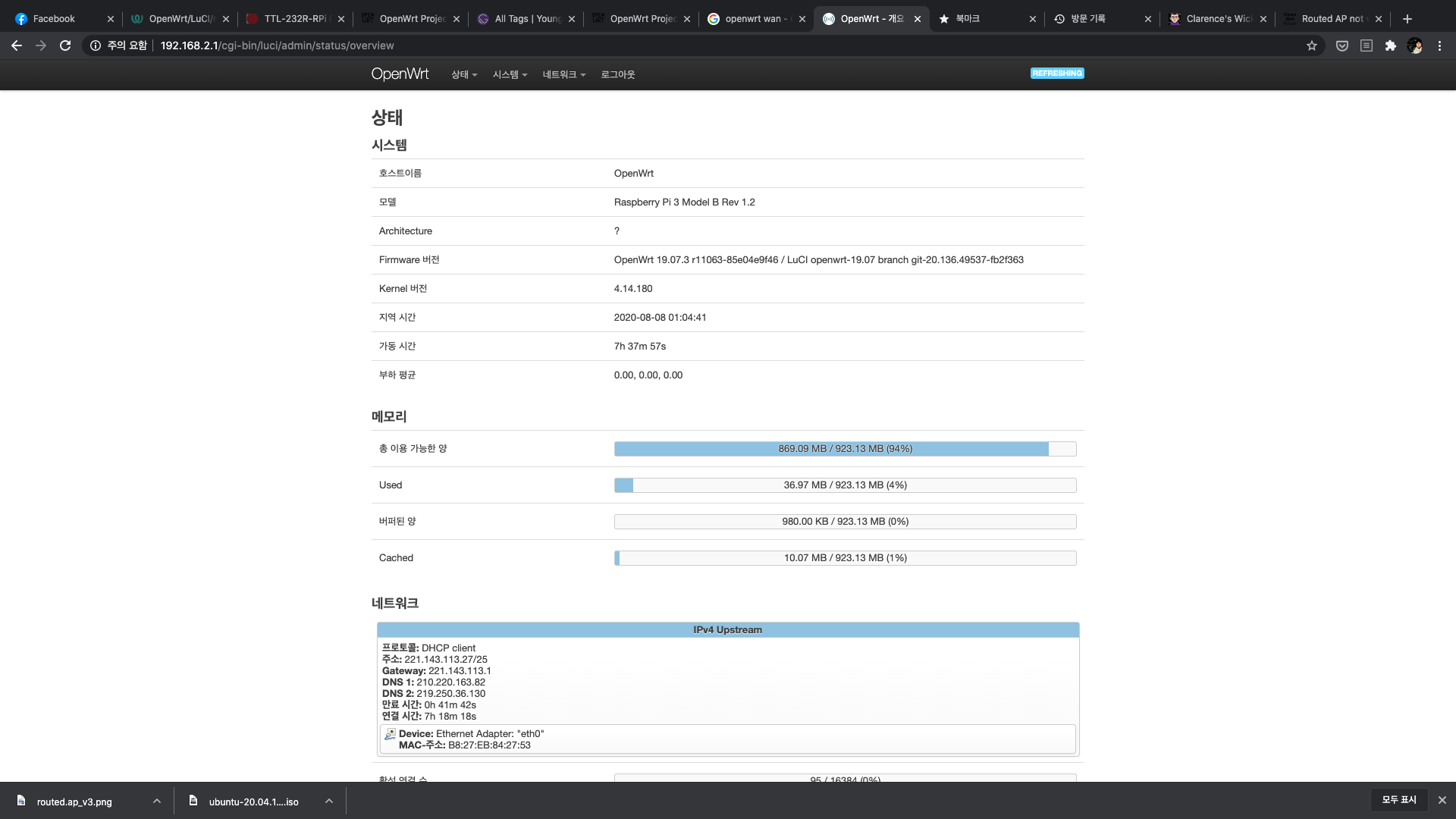 그러던 중 서럽에 라즈베리파이3 모델B 가 있는걸 발견했다. 그리고 여기에다가 OpenWRT 올려다 굴리면 대충 공유기로 사용할 수 있을 거라는 생각이 들었다. 때마침 방 안에있는 벽에 랜 포트가 있어 노트북에 직접 연결하니 잘 연결된다. 그렇게 통신사 공유기 때문에 삽질이 시작되었다.