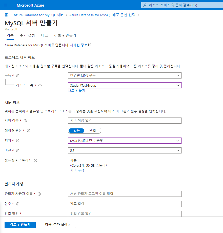그리고 목적에 맞게 리소스 그룹, 백업 여부, 위치, 버전, 성능 등을 설정해 주자. 필자의 경우 DB를 테스트 용도로만 잠깐 쓸 용도여서 위와 같이 설정하였다. 만약 프로덕션으로 사용할 경우, 백업 설정을 해 주고 컴퓨팅+스토리지 선택지는 기본이 아닌 범용이나 메모리 최적화 선택지를 선택하는 것이 적합할 것이다.