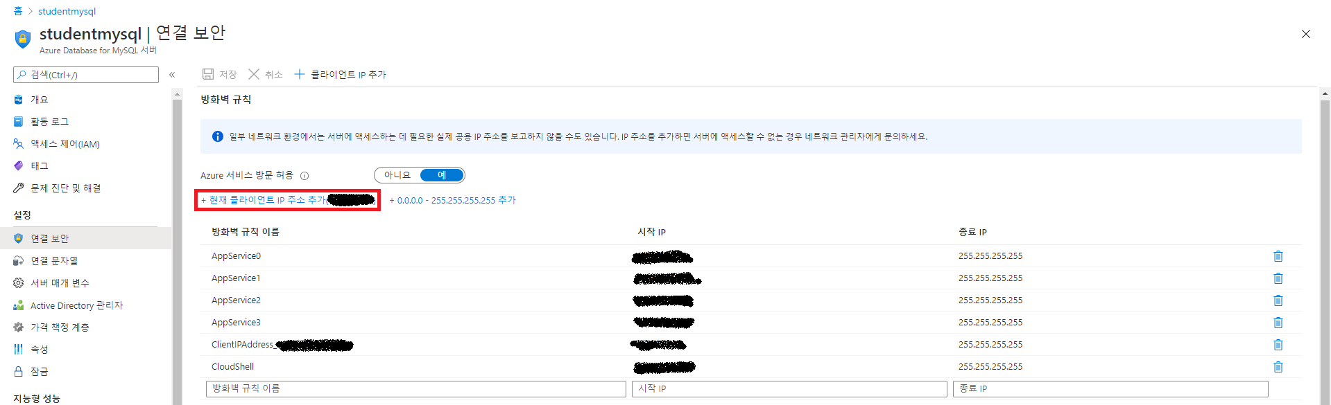 여기서 화면 상단에 현재 클라이언트 IP주소 추가(x.x.x.x) 를 클릭하여 현재 Azure Portal 에 접속중인 본인의 PC IP 추가가 가능하다. 클릭하여 추가한 뒤 저장한다.