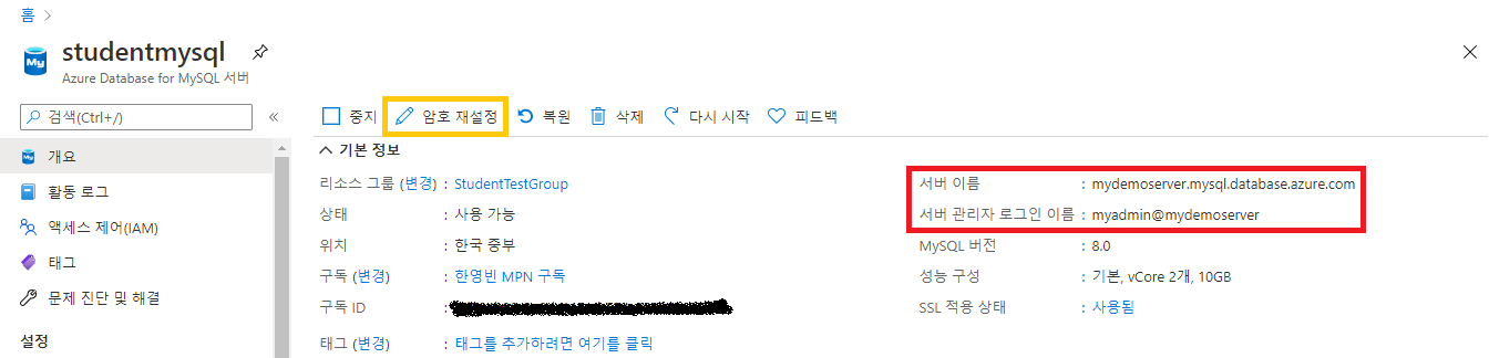 여기서는 MySQL CLI 클라이언트로 접속했지만, MySQL Workbench, QueryPie 등으로 접속해서 사용해도 좋다. 만약 접속에 사용할 관리자 암호를 분실했다면, 개요화면의 암호 재설정 버튼으로 초기화 하면 된다.