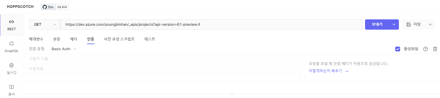 PAT 로 인증 또한 해 주어야 하는데요, 이 문서에 따르면 Basic Auth 방식으로 인증하면 된다고 나와 있습니다. GUI 로 HTTP 요청을 만들어 테스트 해 볼수 있는 hoppscotch를 사용하여 간단히 테스트 해 보겠습니다.
