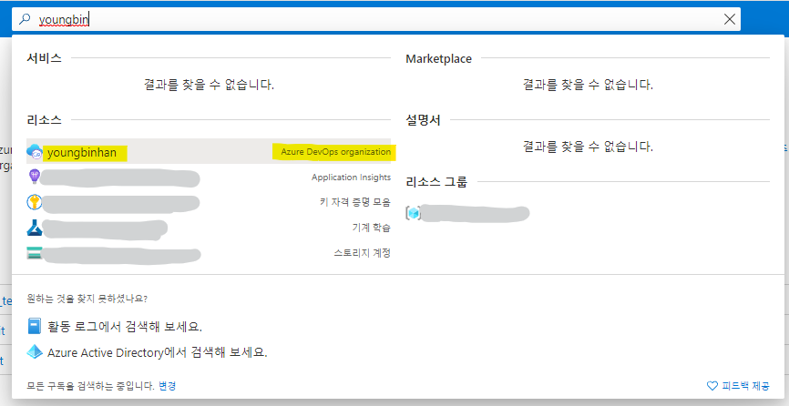 구독을 연결하면, Azure Portal 에서도 Azure DevOps Organization 리소스로 조회가 가능 한 것을 확인할 수 있습니다. 하지만 이름만 조회 될 뿐, 클릭하여 들어가면 Azure DevOps 로 리다이렉트 해 주는 화면만 나오는 것이 다 입니다.
