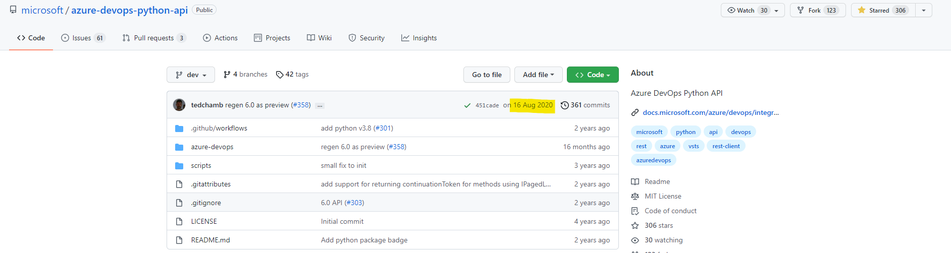 최근 회사 내에서, 기존 클라우드 점검 스크립트에 새 기능을 넣는 작업을 하고 있는데요. 이번에 작업을 하면서 Azure DevOps 점검도 자동화 할 필요가 있어, Azure DevOps 를 점검하는 기능도 구현하고 있습니다. 기존 Azure 의 리소스를 점검할 때는 Azure SDK for Python 으로 충분했지만, Azure DevOps는 원래 Visual Studio Team Services 였던 서비스가 이름이 바뀌고 변화해 온 서비스여서, Azure 와는 별개로 사용됩니다.