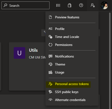 인증에 사용할 PAT를 간단히 발급해 보겠습니다. 먼저 Azure DevOps 화면에서 우측 상단의 프로필 버튼 바로 옆에 설정 버튼을 누르면 아래와 같은 메뉴가 나타납니다. 여기서 Personal access tokens를 선택하여 들어갑니다.