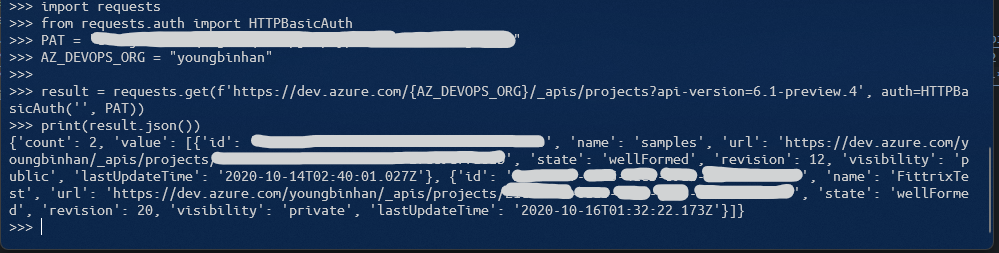 result = requests.get(f'https://dev.azure.com/{AZ_DEVOPS_ORG}/_apis/projects?api-version=6.1-preview.4', auth=HTTPBasicAuth('', PAT))
