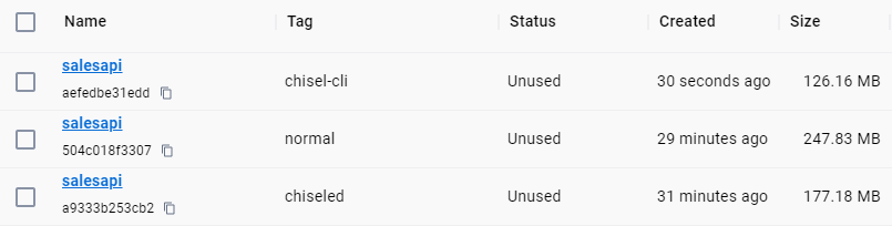 이렇게 작성한 Dockerfile로 컨테이너 이미지를 빌드해서 비교 해 보면, Chisel Container 기반 이미지가 적게는 70mb에서 많게는 120mb정도 더 작은 사이즈임을 알 수 있습니다.