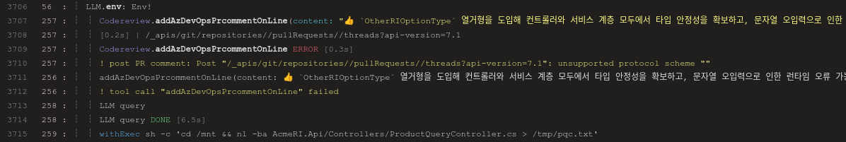 인라인으로 코멘트를 다는 부분은, 인라인 코멘트 달도록 Azure DevOps API를 호출하는 Dagger Function 을 만들고 이를 LLM에서 툴로 호출 하도록 구성하는 작업을 하였다.